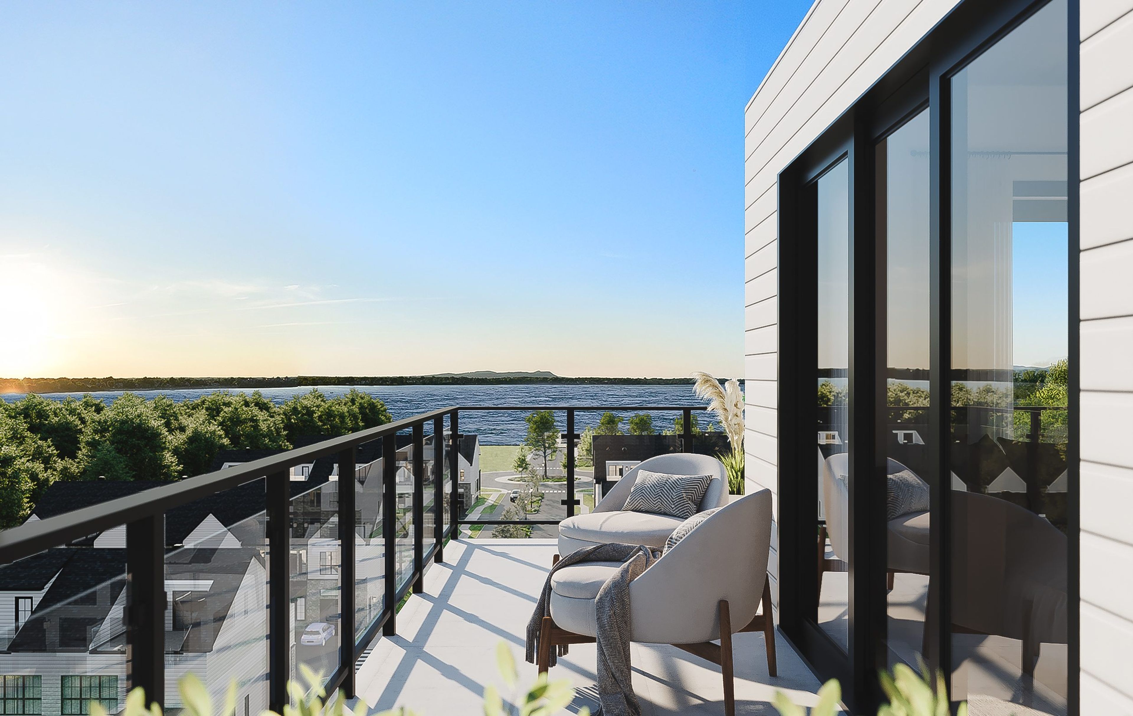 L'immeuble est situé tout près du fleuve Saint-Laurent dans un quartier développé par le promoteur et offrant plusieurs commodités, comme une piscine, un Club House, un spa 4 saisons et plus encore.